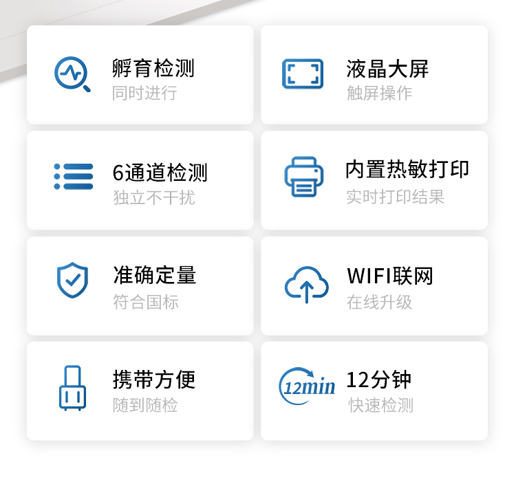 5、6通道设计,可同时进行一种或多种指标的检测,6个独立检测单元,检测效率高,并且互不干扰;