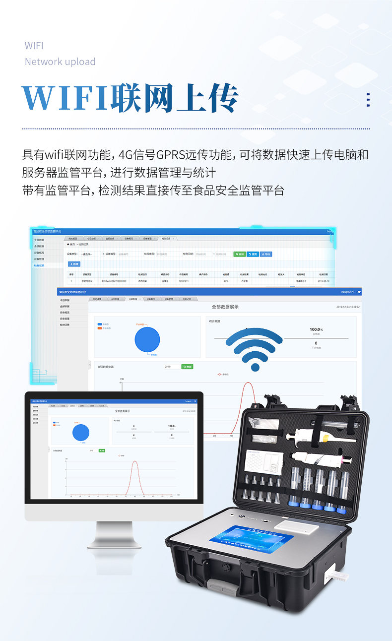 6、仪器具有wifi联网功能,4G信号GPRS远传功能,可插手机卡实现数据远传,可将数据快速上传电脑和服务器监管平台,进行数据管理与统计。