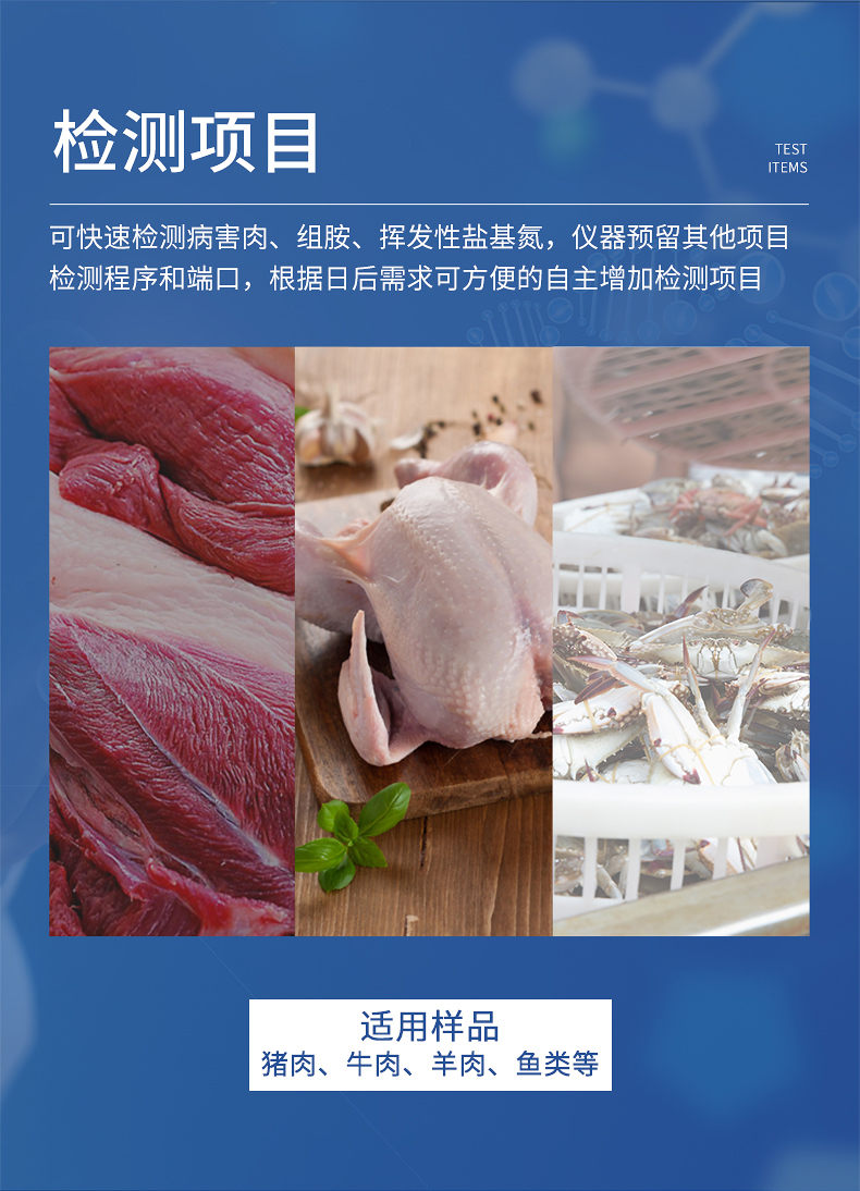 可快速检测病害肉中挥发性盐基氮,仪器预留其他项目检测程序和端口,根据日后需求可方便的自主增加检测项目。